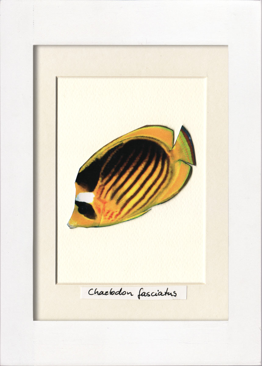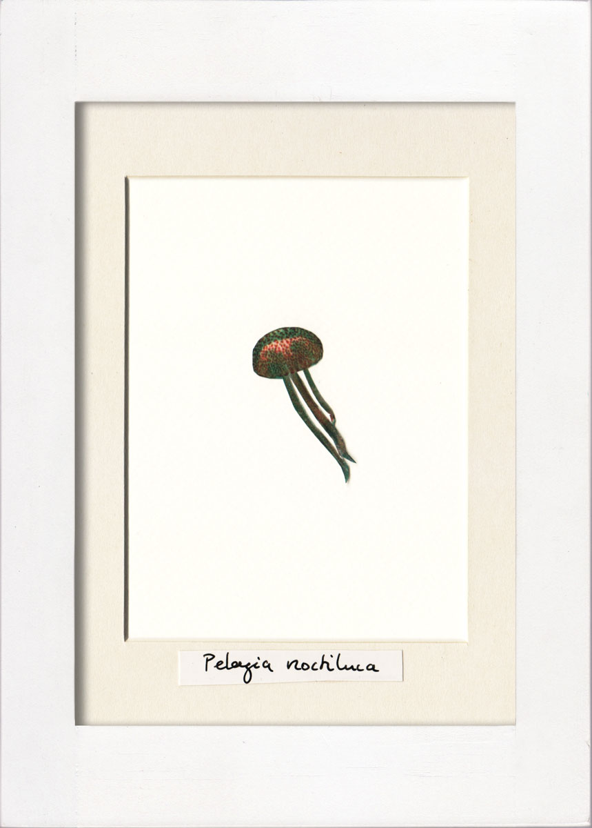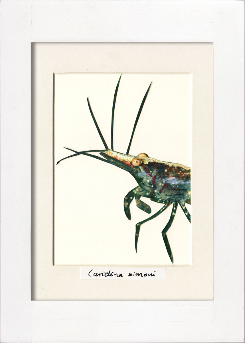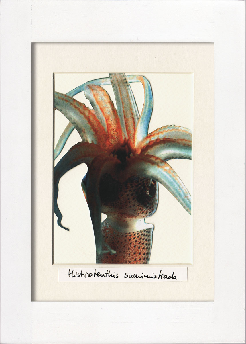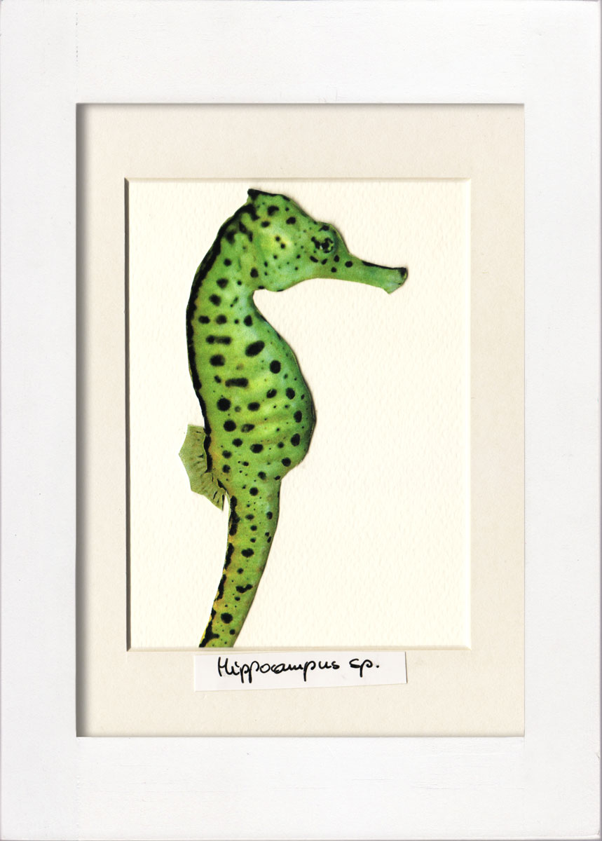 Bewusst rahmte ich die aus Laserdrucken ausgeschnittenen Fotos der Unterwasserlebewesen wie menschliche Portraits: hochformatig, mit Passepartout und im schmeichelnden Holzrahmen. Handschriftlich notierte ich die lateinischen Namen der Gesellen auf den Passepartouts.