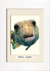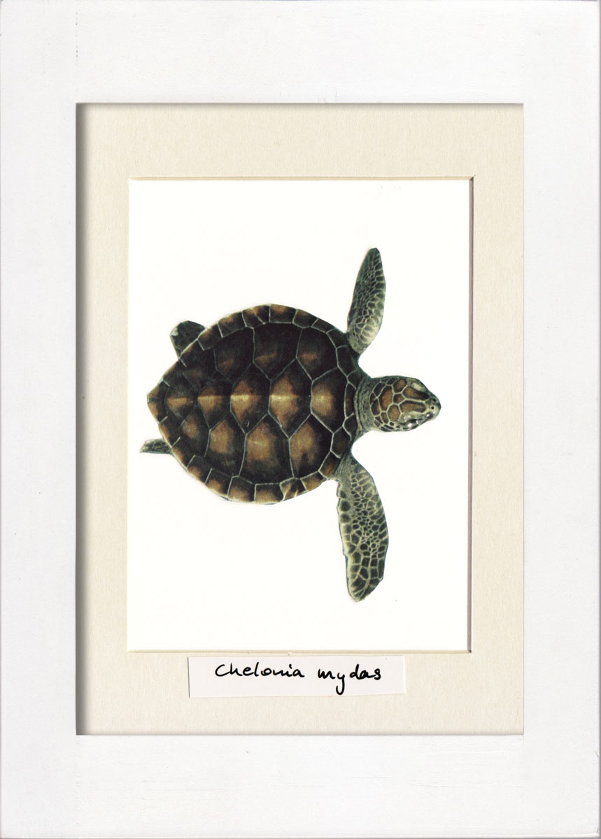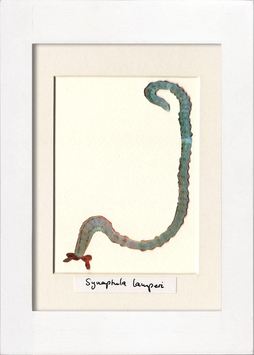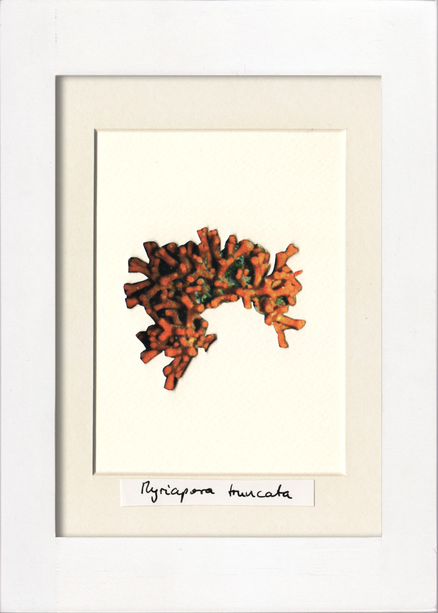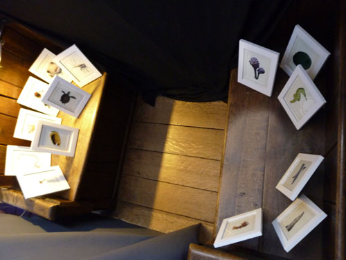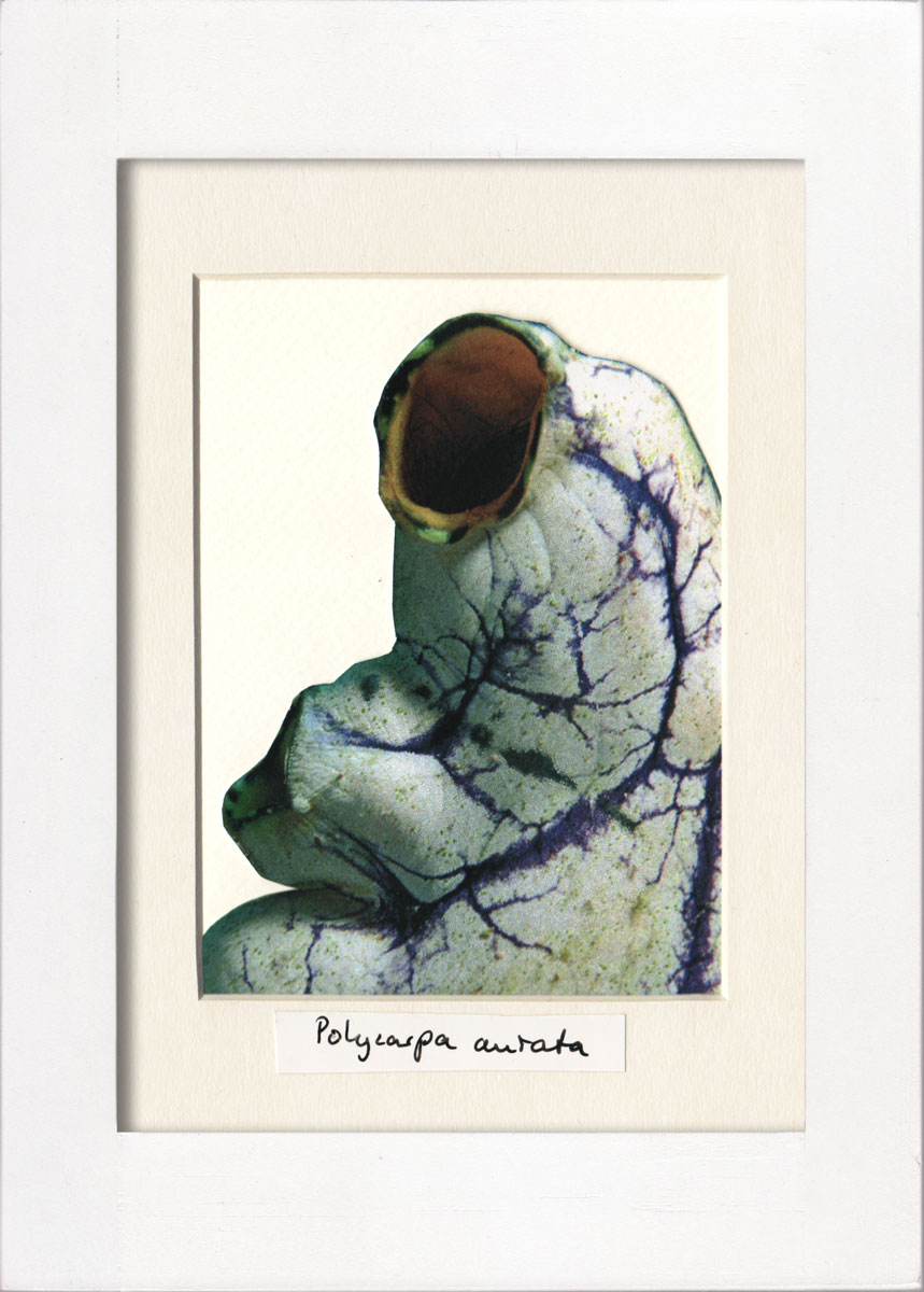 Bewusst rahmte ich die aus Laserdrucken ausgeschnittenen Fotos der Unterwasserlebewesen wie menschliche Portraits: hochformatig, mit Passepartout und im schmeichelnden Holzrahmen. Handschriftlich notierte ich die lateinischen Namen der Gesellen auf den Passepartouts.
