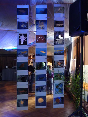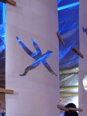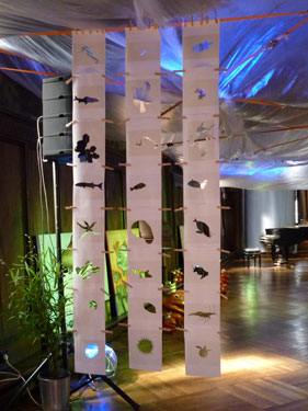 Ein Vorhang aus 24 Bögen dünnem Papier mit aufgedruckten Szenen der Unterwasserwelt, aus denen ich das abgebildete Lebewesen säuberlich mit einem Skalpell herausgetrennt habe, bildet die Papierarbeit "Räume". Die Bögen hänge ich mit Klammern aneinander befestigt frei in den Raum. Die Arbeit wirkt fragil, womit ich die Zerbrechlichkeit des Ökosystems Weltmeere widerspiegeln möchte. Die fehlenden, da herausgetrennten Lebewesen hinterlassen große Löcher in den Papieren wie auch dem Ökosystem die verschwundenen Arten unwiederbinglich fehlen. |