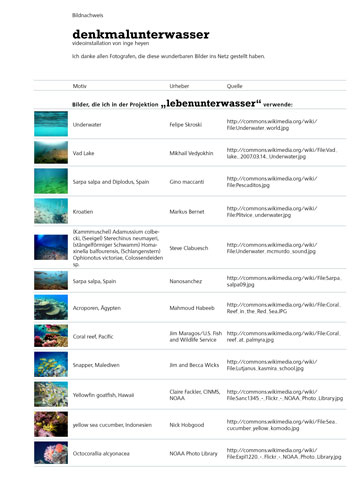 Ich verwende für diese Installation 71 Fotos von 51 Fotografen weltweit. Die Fotografen stellen ihre Arbeiten zum größten Teil auf wikimedia commons unter der Creative-Commons-Lizenz, der GNU-Free-Documentation-Lizenz oder gemeinfrei zur Verfügung. Dieser Bildnachweis listet alle verwendeten Fotos mit Vignette, Beschreibung, Urheber und Quelle. Ich sehe ihn als wesentlichen Bestandteil meiner Installation im Spannungsfeld zwischen meiner eigenen Konsumlust und hilflos tolerierter Umweltveränderung. Bildnachweis zum Download (PDF). |