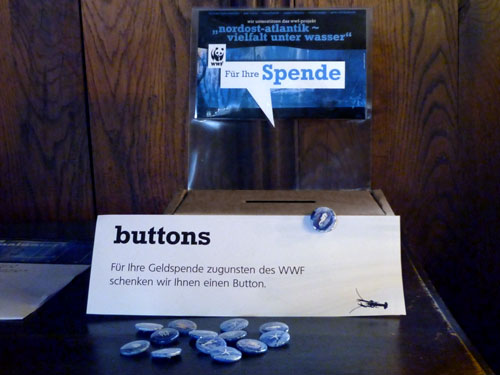 Für jede Spende zugunsten des WWF bedankten wir uns mit einem frisch gepressten Button mit einem unserer Symbole. Das beliebteste Motiv war mit Abstand das Seepferdchen.
