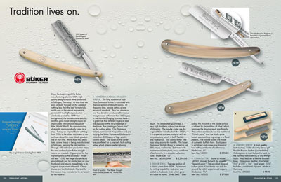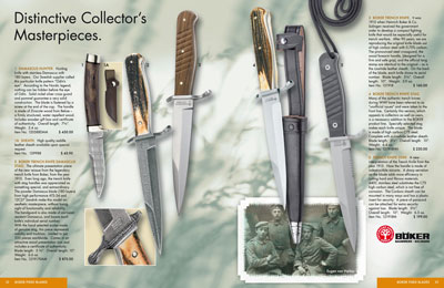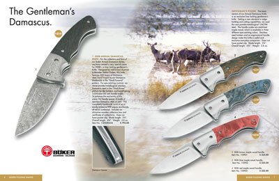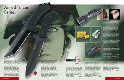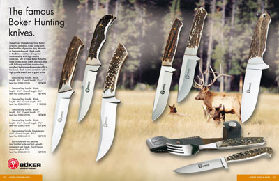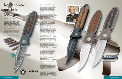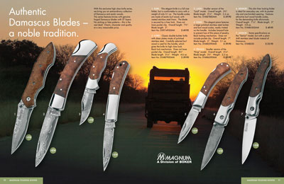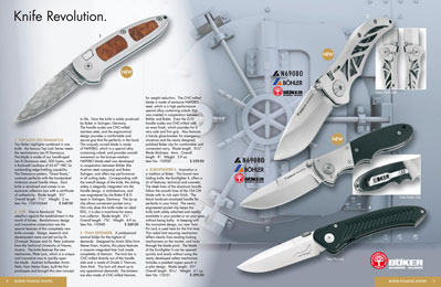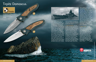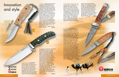 Die amerikanische Niederlassung Boker USA gibt ihren eigenen Katalog heraus. Das Sortiment ist auf den amerikanischen Markt abgestimmt: Damastklingen, Tactical Knives, traditionelle Modelle, Kochmesser, Rasiermesser und verschiedene Sammlerstücke. Ich übernahm die Ausarbeitung und Druckvorbereitung der 144 Seiten dieses Katalogs. Seite für Seite füllte ich das Basislayout mit Produktbildern, Texten und Stimmungsbildern. Ich arrangierte das Seitenlayout im Detail, wickelte die Korrekturphasen ab und lieferte druckreife PDFs direkt an die amerikanische Druckerei in Denver. |