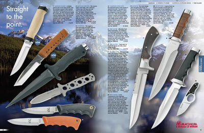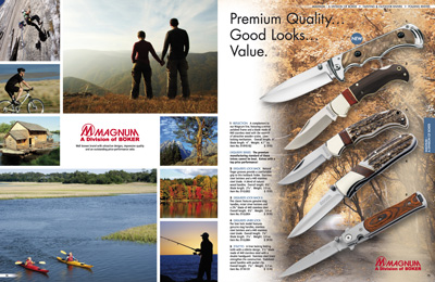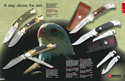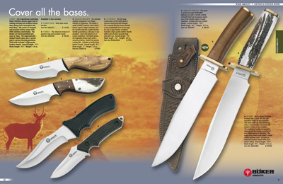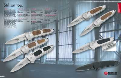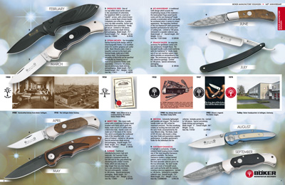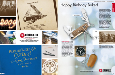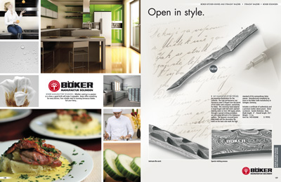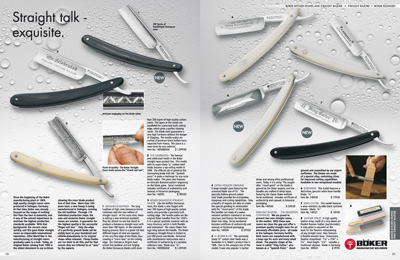 Das Basislayout der Böker-Kataloge sollte nach vielen Jahren nahezu unveränderter Anwendung nun optimiert werden. Dabei sollten die vielen langjährigen Kunden nicht mit zu vielen Änderungen enttäuscht werden. Ich änderte das Layout nur so weit es nötig war, um den neuen Anforderungen gerecht zu werden: Die Gliederung wurde klarer dargestellt und ich gewann erheblich Raum durch meine Überarbeitung von Schriftbild und Satzspiegel. Dieses neue Layout setzte ich für die 124 Seiten des amerikanischen Händler-Kataloges um. Dabei gehörte es zu meinen Aufgaben, die Artikel seitenweise zu gruppieren und neues, passendes Bildmaterial zu suchen. Auch die kurze Bildergeschichte auf den Seiten 5 - 7 anlässlich des 140. Firmenjubiläums erarbeitete ich, wobei mir der Senior-Chef persönlich den ebenso notwendigen wie spannenden Geschichtsunterricht gab. Der deutschsprachige Hauptkatalog wurde anschließend im selben Layout angelegt. |