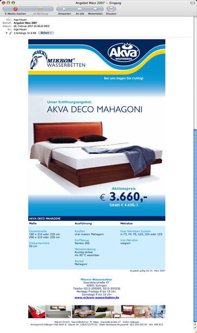 Mit gestalteten Emails half ich dem Solinger Einzelhändler Mikrom Wasserbetten auf die Sprünge: Anlässlich seines Umzugs wurden über 1000 Emails dieser Art an den Kundenstamm verschickt. Aufgrund der hohen Resonanz wird nun monatlich eine Email mit den aktuellen Sonderangeboten versendet. Diese Emails habe ich im HTML-Format verfasst. Für ein neues Angebot werden zwischen Kopf und Fußelement das Motiv und der Tabelleninhalt ausgetauscht. |