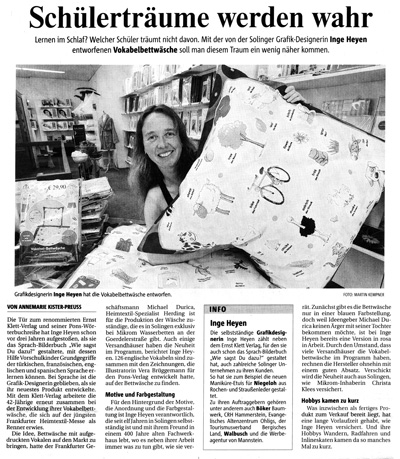 ![]() Foto: Martin Kempner | Schülerträume werden wahr Lernen im Schlaf? Welcher Schüler träumt nicht davon. Mit der von der Solinger Grafik-Designerin Inge Heyen entworfenen Vokabelbettwäsche soll man diesem Traum ein wenig näher kommen. Die Tür zum renommierten Ernst Klett-Verlag und seiner Pons-Wörterbuchreihe hat Inge Heyen schon vor drei Jahren aufgestoßen, als sie das Sprach-Bilderbuch Die Idee, Bettwäsche mit aufgedruckten Vokabeln auf den Markt zu bringen, hatte der Frankfurter Geschäftsmann Michael Durica, Heimtextil-Spezialist Herding ist für die Produktion der Wäsche zuständig, die es in Solingen exklusiv bei Mikrom Wasserbetten an der Goerdelerstraße gibt. Auch einige Versandhäuser haben die Neuheit im Programm, berichtet Inge Heyen. 126 englische Vokabeln sind zusammen mit den Zeichnungen, die Illustratorin Vera Brüggemann für den Pons-Verlag entwickelt hatte, auf der Bettwäsche zu finden. Motive und Farbgestaltung Für den Hintergrund der Motive, die Anordnung und die Farbgestaltung ist Inge Heyen verantwortlich, die seit elf Jahren in Solingen selbstständig ist und mit ihrem Freund in einem 400 Jahre alten Fachwerkhaus lebt, wo es neben ihrer Arbeit immer was zu tun gibt, wie sie verrät. Zunächst gibt es die Bettwäsche nur in einer blauen Farbstellung, doch weil Ideengeber Michael Durica keinen Ärger mit seiner Tochter bekommen möchte, ist bei Inge Heyen bereits eine Version in rosa in Arbeit. Durch den Umstand, dass viele Versandhäuser die Vokabelbettwäsche im Programm haben, rechnen die Hersteller ohnehin mit einem guten Absatz. Verschickt wird die Neuheit auch aus Solingen, wie Mikrom-Inhaberin Christa Klees versichert. Hobbys kamen zu kurz Was inzwischen als fertiges Produkt zum Verkauf bereit liegt, hat eine lange Vorlaufzeit gehabt, wie Inge Heyen versichert. Und ihre Hobbys Wandern, Radfahren und Inlineskaten kamen da so manches Mal zu kurz. Info: Inge Heyen Die selbstständige Grafikdesignerin Inge Heyen zählt neben dem Ernst Klett Verlag, für den sie auch schon das Sprach-Bilderbuch Wie sagst Du dazu? gestaltet hat, auch zahlreiche Solinger Unternehmen zu ihren Kunden. Zu ihren Auftraggebern gehören unter anderem auch Böker Baumwerk, CRH Hammerstein, Evangelisches Altenzentrum Ohligs, der Tourismusverband Bergisches Land, Walbusch und die Werbeagentur von Mannstein. |