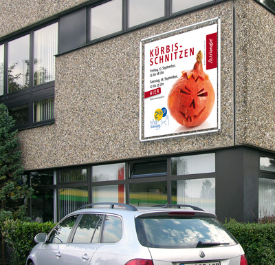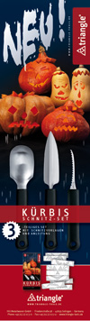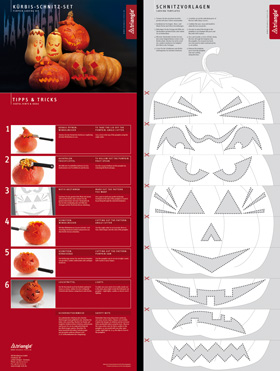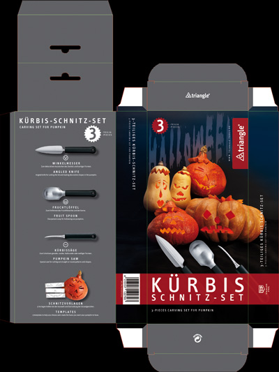 Pünktlich zum Herbstanfang sollte das neue Kürbis-Schnitzset der Marke triangle® auf den Markt gebracht werden. Während noch Kürbissäge, Winkelmesser und Fruchtlöffel zur Perfektion reiften, wurde auch die Vermarktung des Sets in Angriff genommen: Verpackung und Anzeigen wurden entwickelt. Ich gestaltete die Verpackung für das 3er-Set und assistierte bei den Aufnahmen der Stimmungs- und Anwendungsbilder. Als Bonbon sollte den scharfen Tools ein Faltblatt mit Schnitzvorlagen und -anleitung beigefügt werden. Dazu entwarf ich einen Leporello, den der Anwender auseinanderschneidet, um dann Mund- Nasen- und Augenpartien frei zu kombinieren. Weitere Elemente waren eine Anzeige für Fachzeitschriften und ein Banner, der zum Kürbisschnitzen während des stadtweiten Events Solingen 24 Stunden live einlud. |