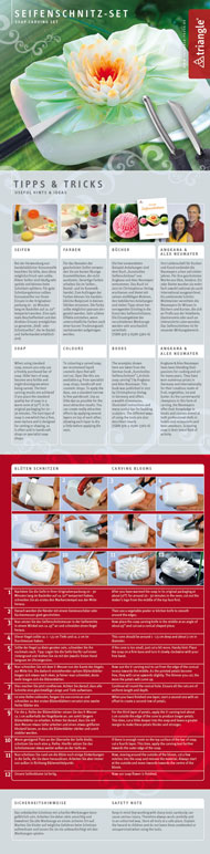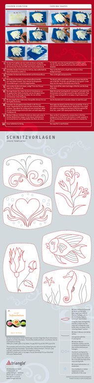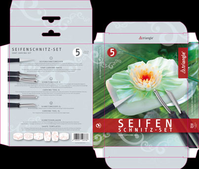 Nicht nur Lebensmittel, auch Seifen können mit den triangle®-Tools geschnitzt und verziert werden. Ich gestaltete die Verpackung für dieses spezielle Set im gleichen Look wie die Verpackungen für die herkömmlichen Tools. Einzig durch den helleren Grauton des Fonds und die zarten Ornamente darin hebt sich dieses besondere Produkt von den anderen Tools und Sets der Marke triangle® ab. Ein informativer Produktbeileger erläutert die Handhabung der Tools anhand von Schnitzanleitungen. Der Anwender kann zudem aus 6 Schnitzvorlagen wählen und diese auf sein Werkstück übertragen. Die verschiedenen Farben der Linen in den Vorlagen kennzeichnen, mit welchem Tool die jeweilige Kontur auszuführen ist. So ist ohne viel Worte viel erklärt. |