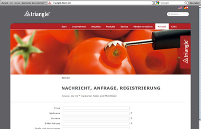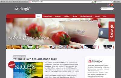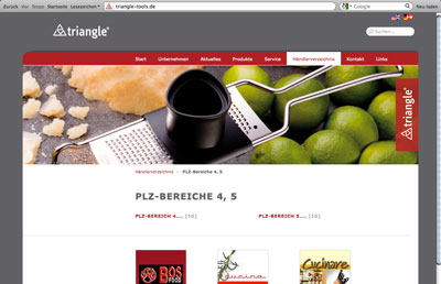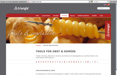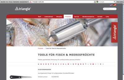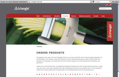Individuell, übersichtlich und detailreich sollte die neue Internetseite des Küchen-Tool-Spezialisten triangle werden. Die Site für Händler und Endverbraucher stellt viele Ansprüche an Konzept und Gestaltung: Die Mitarbeiter möchten die Inhalte selber einpflegen - mehr als 200 Tools der Marke triangle, Artikel zur Verkaufsförderung und Bücher sind hier gelistet. Außerdem gibt es Informationen zur Firmengeschichte, ein Händlerverzeichnis und einen geschützten Servicebereich für registrierte Kunden. Ich entwarf eine Gliederung und das Basislayout. Unter Verwendung der schönsten Produktbilder erstellte ich Keyvisuals zu jedem Thema. Ich übermittelte dem Web-Programmierer die nötigen Informationen zu Farben, Schriften und erstellte weitere Gestaltungselemente. |