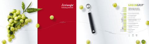 Für die Rückwand des triangle-Messestandes auf der Ambiente 2013 in Frankfurt gestaltete ich diesen großformatigen Druck. Der 10 Meter breite Stand an einer Stirnseite des Ganges G in Halle 3.1 wirkt schon von Weitem. Hingucker am Rande: Die unteren Gurkenkugeln liegen exakt auf der rückwärtigen Sitzbank auf, die sich über die gesamte sichtbare Breite erstreckt. |