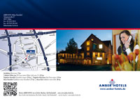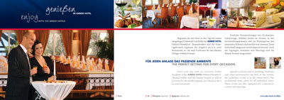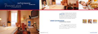Mit diesen 8-seiteigen Broschüren stellen sich die Häuser der Amber Hotels vor: Der Charme der Lage, die Zimmer und Räumlichkeiten für Veranstaltungen und Tagungen werden beleuchtet. Ich entwickelte ein einheitliches Layout für alle Häuser, das sich an den bisherigen Publikationen orientiert. Besonderen Wert legte ich auf die Auswahl individueller und stimmungsvoller Aufnahmen, insbesondere bei der Beschreibung der Lage des Hotels. Ich half beim Texten schlagkräftiger Headlines und arbeitete die 8-seitigen Prospekte bis zur Druckreife aus. |