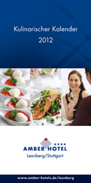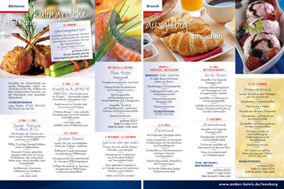 Mit diesem 6-seitigen Prospekt bewirbt das 4-Sterne-Haus im schwäbischen Leonberg seine kulinarischen Aktionen. Im ganzen Jahr wird es saisonale Menüs und Büffets geben. Ich wählte das Bildmaterial aus den Beständen der Hotels und aus kommerziellen Fotoarchiven. Mit dezenten Verlaufsflächen schaffte ich Übersichtlichkeit. Im gleichen Layout, jedoch mit verschiedenen Inhalten, gestaltete ich die Prospekte zu den kulinarischen Angeboten an den anderen Standorten der Amber Hotels. |