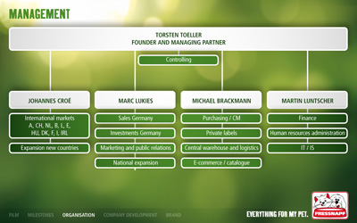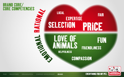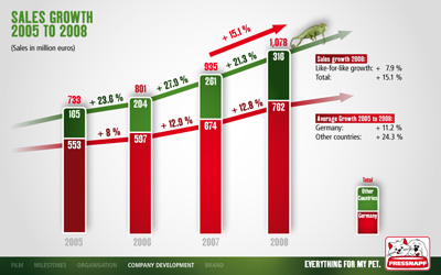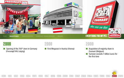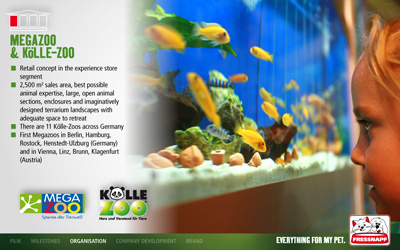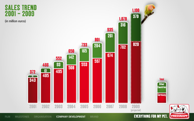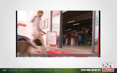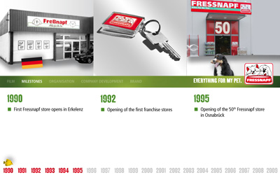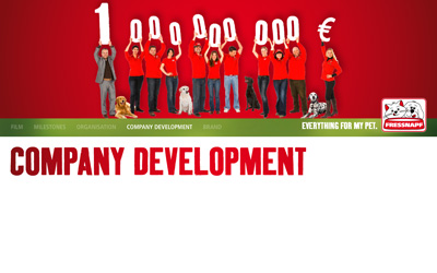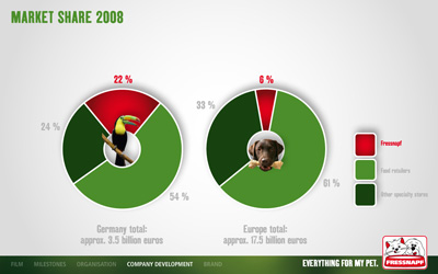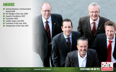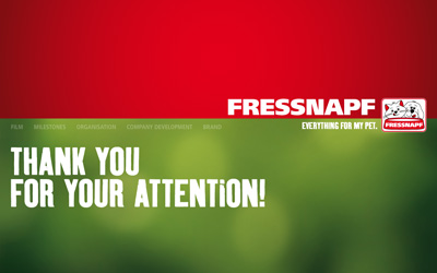 Die beeindruckende Geschäftsentwicklung des Unternehmens Fressnapf stelle ich hier in einer interaktiv führbaren Präsentation dar. Der Vortragende kann während der Präsentation über eine Menüleiste (Banderole) zwischen den einzelnen Kapiteln springen, den Unternehmensfilm im selben Fenster abspielen oder entspannt die sanft überblendeten Seiten durchblättern. Diese Form der Selbstdarstellung repräsentiert nicht nur inhaltlich sondern auch formell die Innovationsfreude und den Erfolg des Unternehmens. Bei der Entwicklung des Layouts nutzte ich die Elemente der Corporate Identity wie Schriften und Farbigkeit. Dank meines grafischen Konzepts wei? der Betrachter immer, an welcher Stelle der 59-seitigen Präsentation er sich gerade befindet. Die von mir gestalteten Grafiken konkretisieren ungezwungenen, klar und deutlich, was den Erfolg des Unternehmens ausmacht. Ganz nebenbei wird man zudem von locker verstreut auftretenden Tiermotiven amüsiert. |