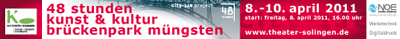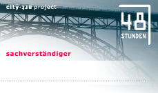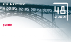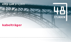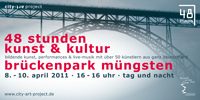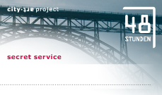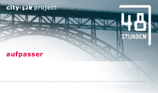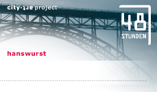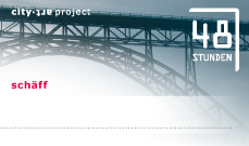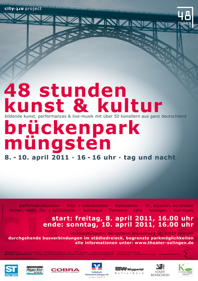 Ich half bei der Organistaion des Kunst-Events "48 Stunden Kunst & Kultur" mit dem Entwurf der Printmedien, die für Werbung und Durchführung der Veranstaltung benötigt werden: Neben den unvermeidlichen Flyern (10.000) und Plakaten (3.000) warben Anzeigen in den Tageszeitungen und Banner für das Event. Die Namensschildchen der Helfer trumpften mit witzigen Jobbezeichnungen. Hinzu kamen Beschriftungen, Hinweisschilder, Lieferantenausweise, Preislisten, Bons... Außerdem habe ich vor Ort Künstlerisches beigetragen: Mein Werk Die 48-stündige Veranstaltung mit 50 Künstlern, 50 Helfern und etwa 13.000 Gästen organisierte Timm Kronenbergs city-art project in Zusammenarbeit mit dem Schmied Michael Bauer-Brandes im Brückenpark Müngsten, unterstützt von den Kulturämtern der Städte Solingen, Remscheid und Wuppertal. |