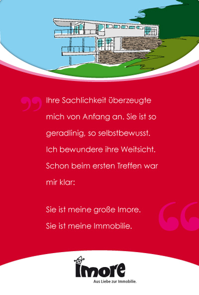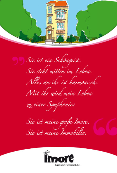 imoreWer eine private Immobilie sucht, sucht sie für lange Zeit. Oft ist eine Partnerschaft fürs Leben geplant. Es ist doch, als suche man die große Liebe? Dieser Gedanke brachte mich dazu, für das Immobilienbüro meines Bruders ganz auf das Thema Liebesglück zu setzen. |
