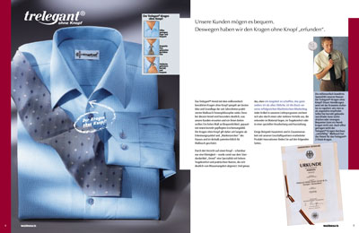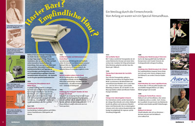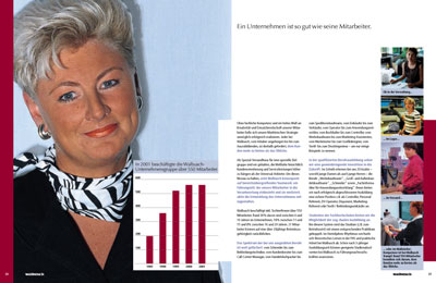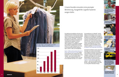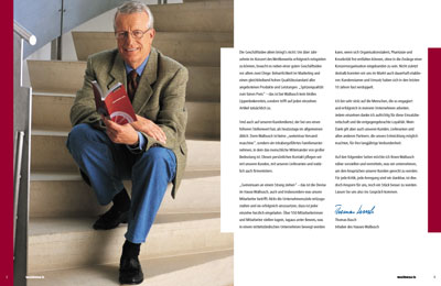 Mit dieser Unternehmensbroschüre stellt Walbusch sich den Geschäftspartnern und der Presse vor. Auf 36 Seiten werden die wichtigsten Kennzahlen, die Bereiche Kundenbetreuung und Auftragsabwicklung und die Firmengeschichte vorgestellt. Meine Aufgabe war die grafische Konzeption und deren Umsetzung: Ich entwickelte das Layout, brachte die Texte in Form, stellte das Bildmaterial zusammen, ergänzte die Bilderleisten, illustrierte die Firmengeschichte und gestaltete die Grafiken. |
