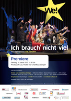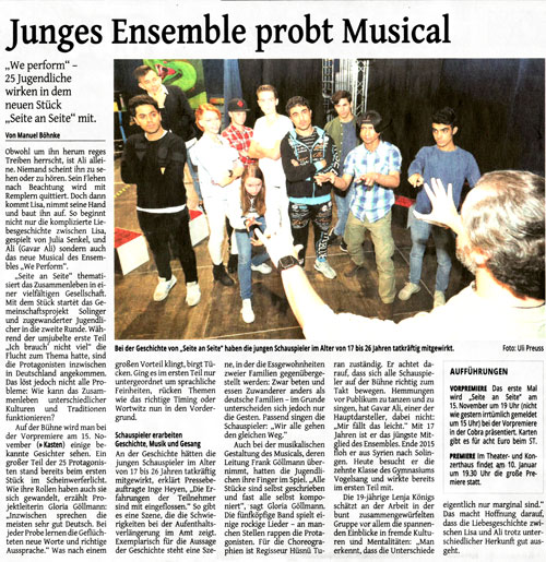 We perform!Solinger und Geflüchtete erarbeiteten in 2016 ein gemeinsames Bühnenprogramm: Unter dem Projektnamen "We perform!" entstand ein Mucical, das am 10. Januar 2017 im Pina-Bausch-Saal des Theater und Kozerthaus Solingen zur Premiere uraufgeführt wurde. Es folgten 2 weitere Produktionen in 2017 und 2018. Ich half mit Öffentlichkeitsarbeit und Grafik-Design. |