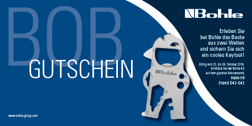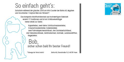 GutscheinMit diesem Gutschein lockt die Bohle AG ihre Kunden auf den Messestand der internationalen Fachmesse Glasstec. Zu gewinnen gibt es das formschöne Multitool "BOB" von Richartz aus dem benachbarten Solingen. |