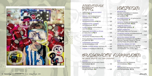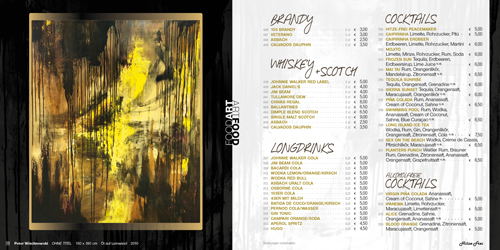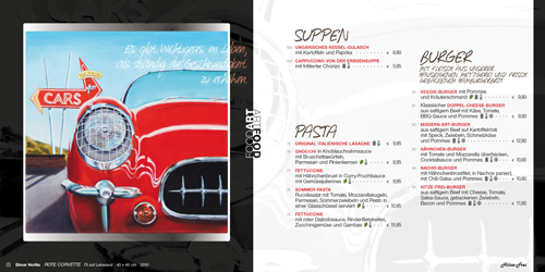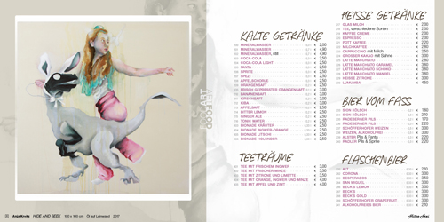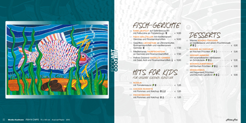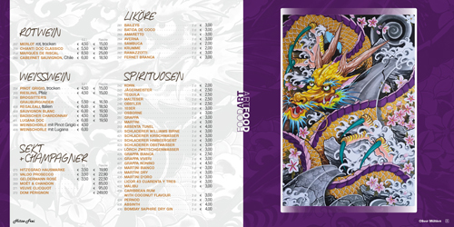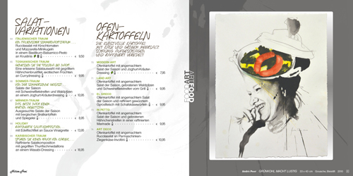 Speisenkarte"Food Art - Art Food" - so lautete das Thema des Restaurants Hitze-Frei für 2018. In meinem Entwurf verband ich Werke regionaler Künstler und die kulinarische Kunst aus der Küche des Restaurants. Das Magazin Gastfreundschaft" prämierte in einem bundesweiten Wettbewerb unsere Arbeit zur besten Sepisekarte 2018. |
